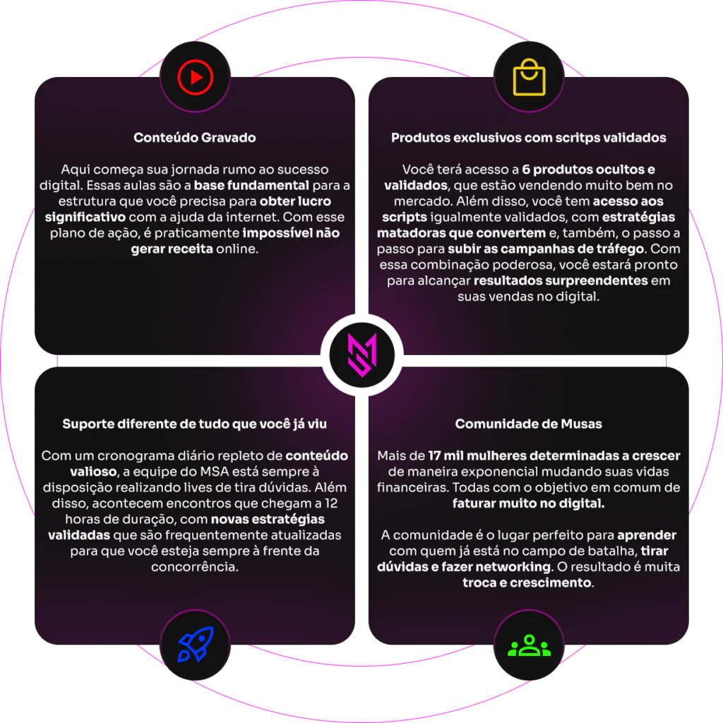 Com o MSA, você terá a oportunidade de descobrir como mulheres comuns estão criando negócios digitais lucrativos e aprenderá as estratégias para alcançar o sucesso financeiro na internet.